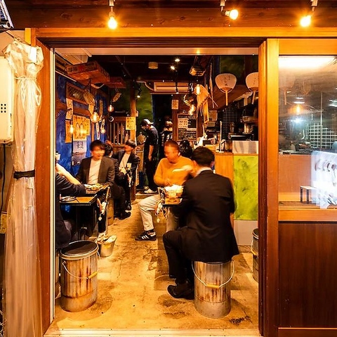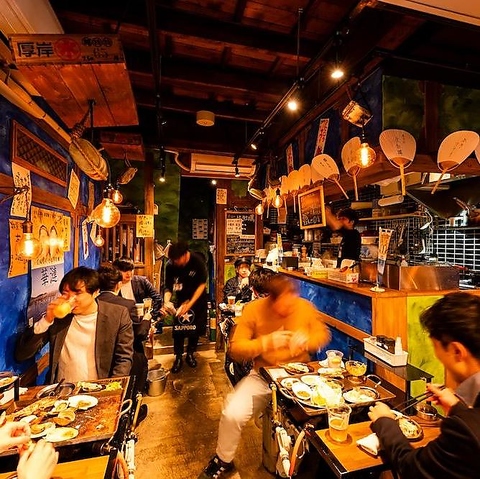鮮やかな青が映える店内は海を連想させる爽やかな印象。店内は活気があり、明るく開放感に溢れています。各テーブルの鉄板で蒸し牡蠣を調理する臨場感をお楽しみいただけます。