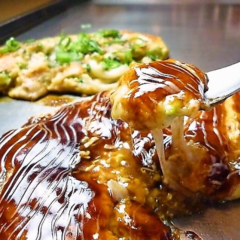 お好み焼きでもない、もんじゃ焼きでもない。和風味の生地を流すのは、230℃の高温に熱した鉄板焼き。具をのせたら、職人のこてさばきで素早く包み上げていきます。焼きあがりは、おもてはパリッ、中はトロリ。スプーンですくって、特製だしをつけてお召し上がり下さい。お好み焼きではなく、もんじゃでもない新しい食感です。