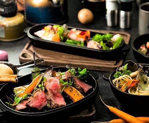 キャンプクッカーにダイナミックかつカラフルに盛り付けされたこだわりの食材料理の数々をご賞味ください◎