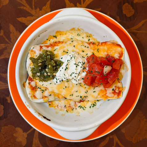 フラワートルティーヤでチリコンカルネ(牛ひき肉と豆のチリ)を包んで、チーズをかけてオーブン焼き!トッピングでハラペーニョとサワークリームとフレッシュトマトが乗った絶品メニューです。