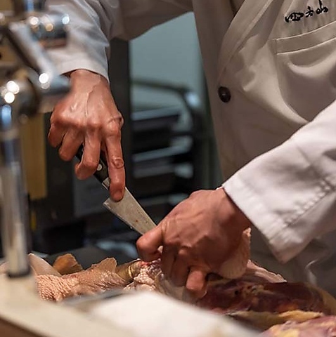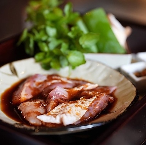 当店で使用しているのは、毎日朝〆した新鮮な軍鶏です。鮮度抜群の軍鶏を丸ごと一羽から捌くことで、さまざまな部位を贅沢にお召し上がりいただけます。炭の高い火力で焼き上げることで、その旨味が最大限に引き出され、秘伝のタレがさらに風味を引き立てます。歯ごたえのある肉質と軍鶏の旨味を存分にご堪能くださいませ。