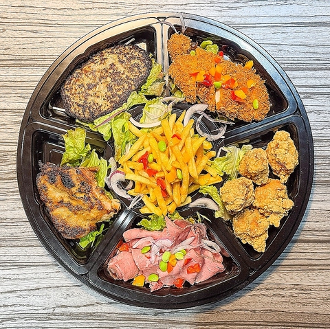 添加物を抑え、那須高原の野菜をたっぷり使用。ハンバーグ×1・チキンカツ・ハニーマスタード唐揚げ・ローストビーフ・グリルチキン・フライドポテト