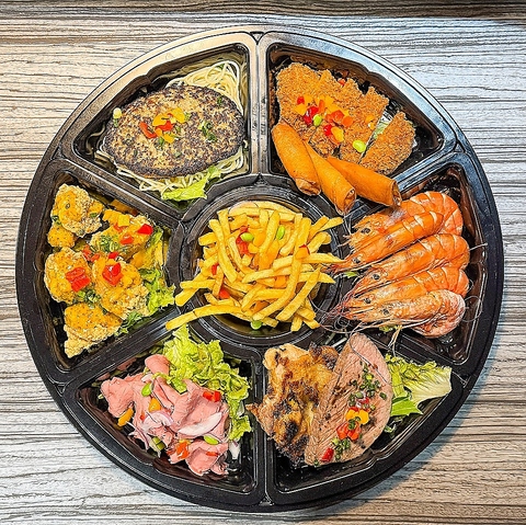 ハンバーグ×2・チキンカツ・春巻き・エビグリル・グリルチキン・ローストビーフステーキ・ローストビーフ・ハニーマスタード唐揚げ・フライドポテト