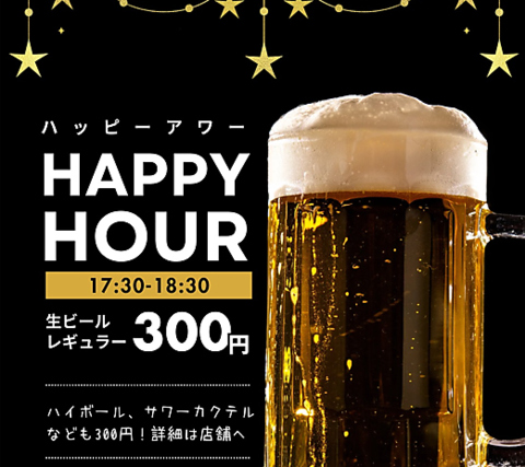 17:30~18:30はハッピーアワー開催中!生ビール、ハイボール、サワーなど300円でご提供!