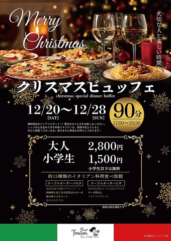 12/20-28☆17時~!約15種類のイタリアン料理食べ放題!前菜やサラダ、メイン、パスタ、ピザが楽しめます♪