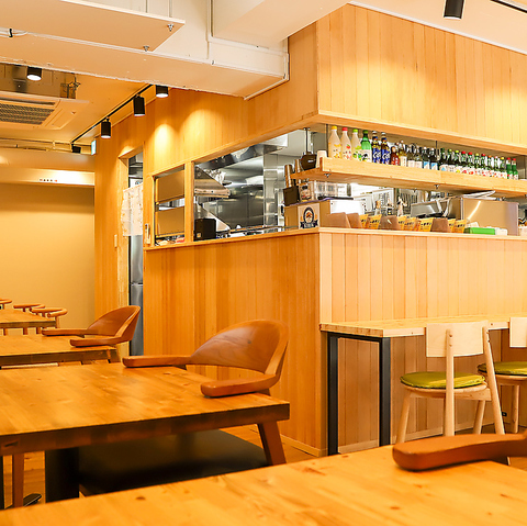木の温もりが感じられる落ち着いた雰囲気の店内。ゆったり座れるチェアとテーブルが並び、カジュアルながらもおしゃれな空間が広がっています。友人や家族との食事、女子会や気軽な飲み会にぴったり。柔らかな照明がリラックスした時間を演出し、心地よく本格韓国料理をお楽しみいただけます♪