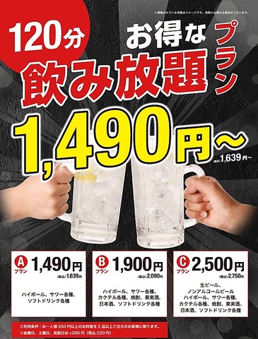 学生の方やサラリーマンの方などにも嬉しい飲み放題1490円(税込1639円)から様々な激安プランをご用意!