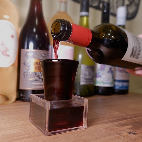 12種類のワインをソムリエが餃子とペアリング!選んだワインを日本酒升に目の前で注ぐ演出も魅力です!