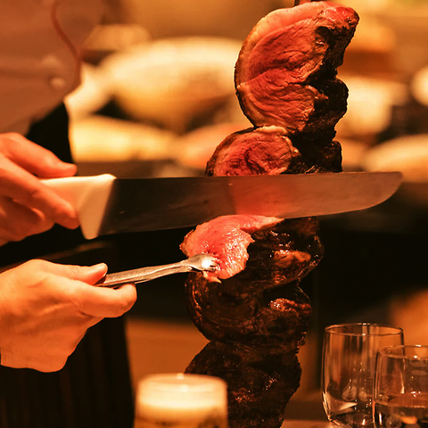 【人気No.1◎】炭火で香ばしく焼き上げるシュラスコや、低温調理で旨味を閉じ込めた名物ローストビーフ、さらに濃厚でとろけるラクレットチーズまで、贅沢な逸品を揃えた特別コース♪ 彩り豊かなイタリアン前菜や自家製パスタも加わり、味わいと華やかさの両方をお楽しみいただけます。