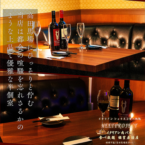 【完全個室完備♪】高田馬場にひっそりと佇む当店は都会の喧騒を忘れさるかのような上品で優雅な半個室を完備しております!また、インテリアや照明での演出にもこだわった店内は間接照明の光に照らされたリラックス空間です◎上質なお食事とお酒を心ゆくまでご堪能ください!女子会や合コン、接待など様々なシーンに◎
