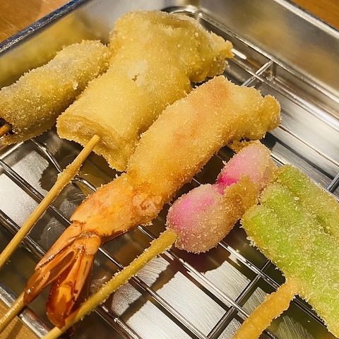 【よりどりみどりの串かつ!】種類豊富な串が皆さまをお待ちしております♪お肉ものや野菜もの、魚介ものもたっぷりご用意!ゆったりおくつろぎ頂ける店内で、絶品のこだわり串をご堪能ください☆