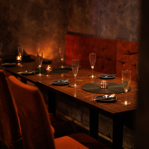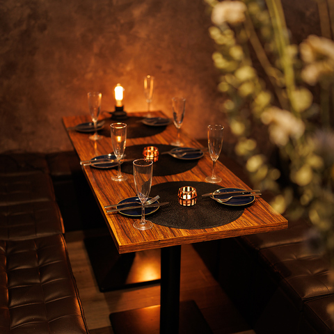 照明を落とした落ち着きのある2名席は、初めてのデートや記念日ディナーに最適。目の前の一皿と会話に集中できる、ちょうどいい距離感が魅力です。