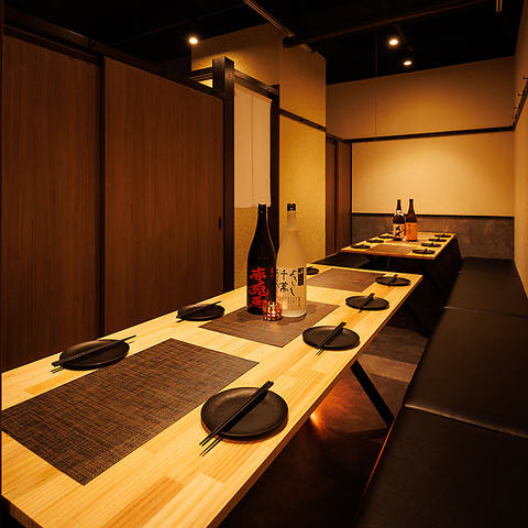 シーンに合わせて使える完全個室!大人数の宴会にも対応可能なロングテーブル個室は、会社宴会・歓送迎会にもピッタリです!シンプルで清潔感のある和モダンインテリアと、テーブルセッティングが雰囲気を演出!ゆったりシートで長時間の宴会も快適!木の温もり温もりある空間で、楽しい時間をお過ごしいただけます!
