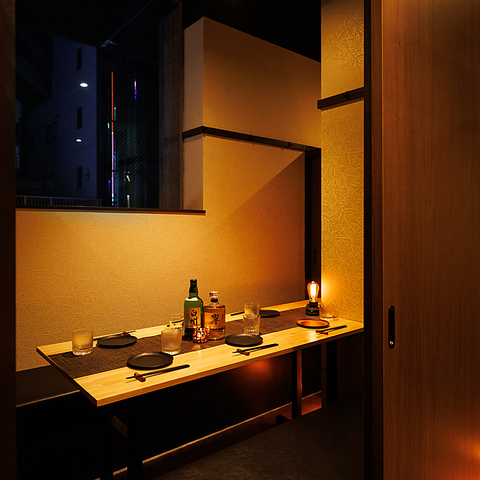 やさしい灯りが心をふわっとほぐす完全個室!夜の街明かりが窓越しに映り込み、特別感のあるひとときを演出してくれます!女子会・合コン・誕生日会にもピッタリ♪落ち着きのある木目のインテリアと、整えられたお皿のセッティングでおもてなし感もバッチリ♪居心地と雰囲気の両方を大切にした、ワンランク上の空間!