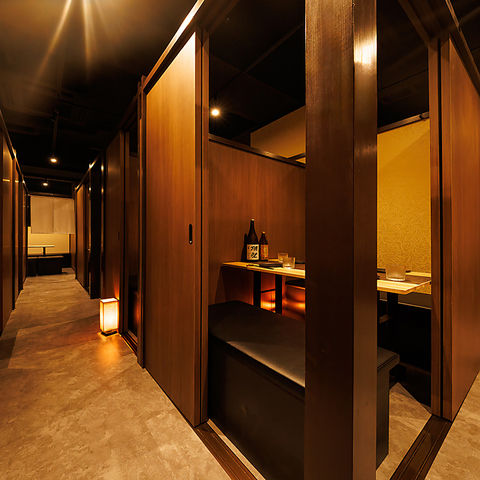 落ち着いた雰囲気が広がる完全個室!扉付きの完全個室で、他のお客様を気にせずゆったりと過ごせるプライベート空間です!温かみのある間接照明と木の温もりが心地よく、デート・女子会・接待・記念日・合コンにもピッタリ♪こだわりのお酒を片手に、ゆっくり過ごせるちょっと特別な時間をお楽しみいただけます!