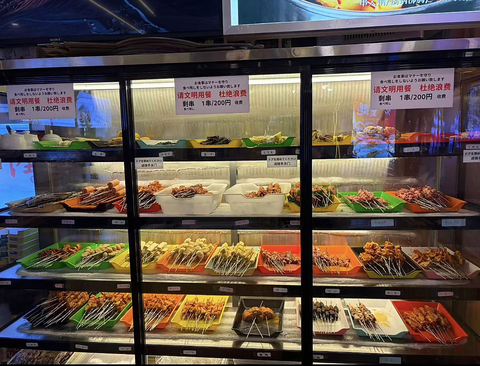 串は20種類以上。お好きなものを選んで、テーブルの専用マシーンでくるくる焼くだけ。更に、果物、点心、中華メニュー(小菜10種、熱菜6種)もご用意しております。これら全部食べ放題。120分 2,980円(税込)でご案内しております。+1,500円でアルコール飲み放題(32種)+500円でソフトドリンク飲み放題も追加可能です。