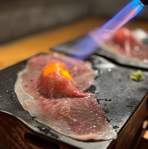 バーナーを使い目の前で一気に炙る和牛寿司は必食