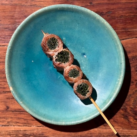 毎日手仕込みを行い、職人が炭火で焼き上げる「野菜肉巻き串」。定番レタスや万能ネギの他、旬の食材も用意