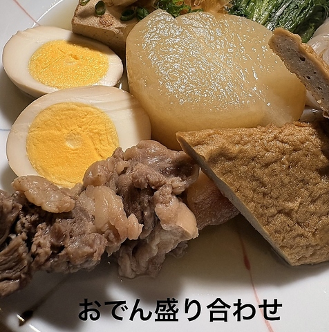 和牛すじ肉、玉子、大根、糸こんにゃく、焼き豆腐、春菊、鶏団子。単品でもお召し上がりいただけます。