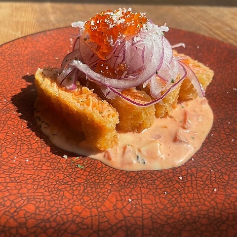 モダンなタイル壁や趣のある木製インテリアが調和した洗練された空間も魅力です。洋食出身シェフの創作料理は、お酒との相性を追求し、目にも美しい逸品ばかり。こだわりのお酒と料理を、特別な雰囲気の中でご堪能ください。