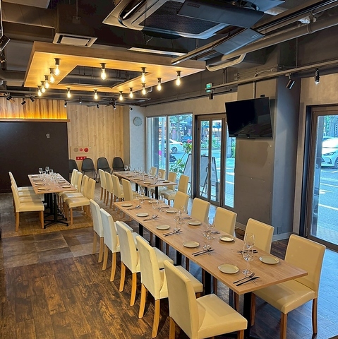 洗練されたモダンな空間で、イタリアンを囲む贅沢なひとときを。着席最大30名、立食スタイルであれば50名まで対応可能な広々とした店内は、貸切パーティーや会社の懇親会、結婚式の二次会にも最適。パソコンをつないで映像を流せるテレビも完備しており、プレゼンや余興にも対応可能です。