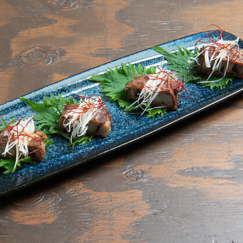 蓮根に豪快に豪快に和牛を巻いて甘辛く味付けしました。シャキシャキの食感と和牛の旨みや甘味がじゅわっと広がるおすすめの一皿◎