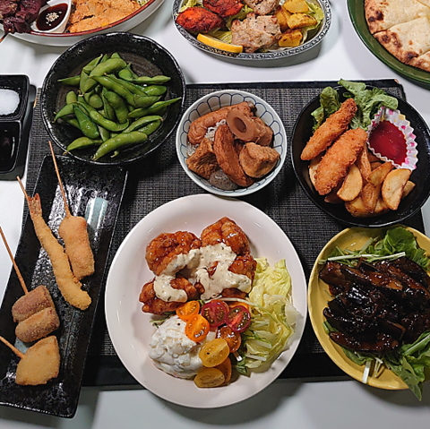 トンカツ・パスタ・焼き鳥・枝豆・チーズナン・ポテトフライ・サラダ※内容は変更になる場合があります。詳しくはお問い合わせください。※完全予約制