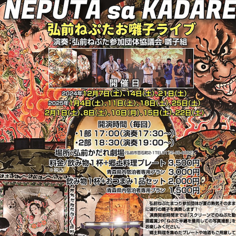 弘前かだれ劇場で定期的に弘前ねぷた祭りのお囃子ライブを開催しております!お囃子を鑑賞しながら津軽の郷土料理が楽しめるプランのほか、0次会にぴったりなおつまみ1品付きプランもございます。