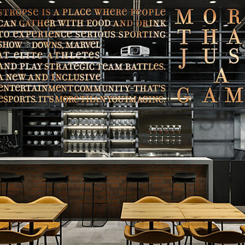 【大人数貸切可◎打ち上げにも♪】店内は開放感溢れる高い天井と、レンガをイメージしたモダンな内装が魅力!席種も豊富にご用意。大きなテーブル席やカウンター席を豊富に完備し、ゆったりとお過ごしいただけます。お仲間とお酒を片手に、eスポーツを楽しんでみてはいかがでしょうか♪プロジェクターもございます♪