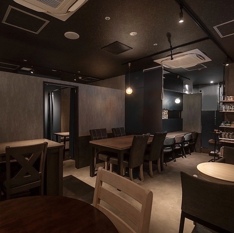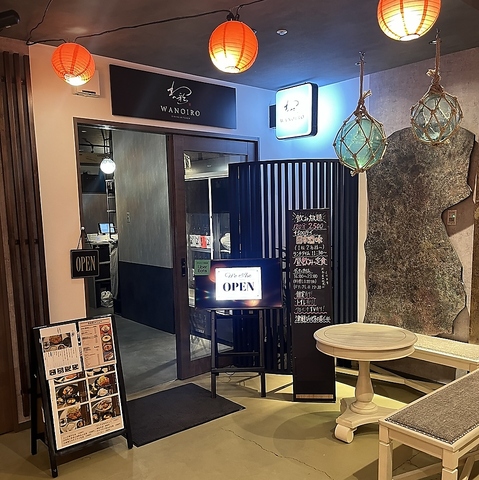 入り口は、非日常の空間へ誘うオシャレな雰囲気が魅力的です。天井から吊るされた温かみが感じられる赤い提灯や、ガラスの浮き玉、壁に掛けられたモニュメントがお出迎えいたします。イスとテーブルもご用意していますので、入店の待ち時間の際もゆっくりとお過ごしください。スタッフ一同ご来店を心よりお待ちしております