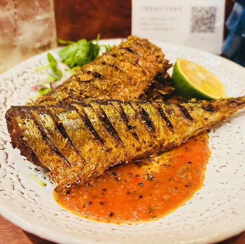南インドのスパイスフィッシュフライの揚げ物「ワルワル」。旬の魚にスパイスをまぶして、高温でカリッと香ばしく揚げ焼きにしました。噛むほどに広がるスパイスの香りと魚の旨味!スパイシーな刺激で、冷たいビールは勿論日本酒にも合います。お試しください♪