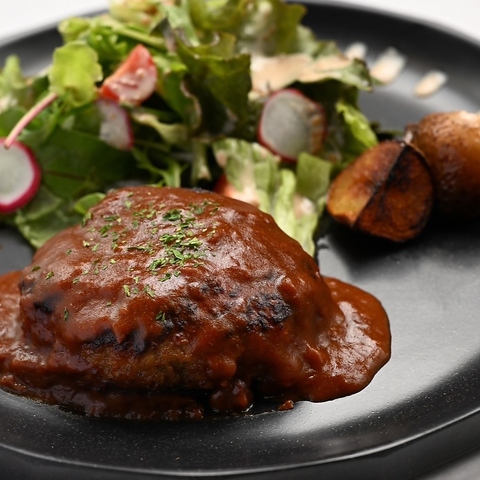 国産牛100%のあふれる旨味がたまらない☆一口食べた瞬間に口いっぱいに広がるジューシーな旨味が特徴!肉厚でやわらかく、じっくりと時間をかけて焼き上げたことで、香ばしい香りとともに国産牛ならではの肉の甘みとスパイスの香りがご堪能いただけます。特製ソースとの相性も抜群!本格ハンバーグをぜひご賞味ください!