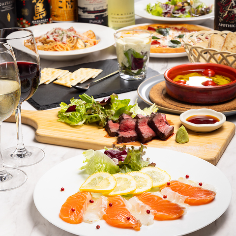 貸切2大特典付き◆25名様以上~幹事様1名無料◆プロジェクター貸出無料※マイクは持ち込みOKです。オードブル5種の盛り合わせ・アヒージョ・パスタ・メインのお肉からデザートまで♪お料理をご堪能いただけます!※3時間飲み放題も対応しております。詳細は、コースをご確認くださいませ。