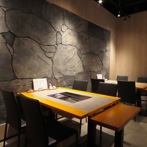 店内は全20席の大人の隠れ家のような雰囲気。贅沢な空間で焼肉を楽しめるのが当店「焼肉居酒屋nikuru」。黒の石壁がシックで高級感を演出し、グレーの木目カウンターが落ち着いた雰囲気を醸し出します。おしゃれな内装で特別なひとときをお過ごしください。