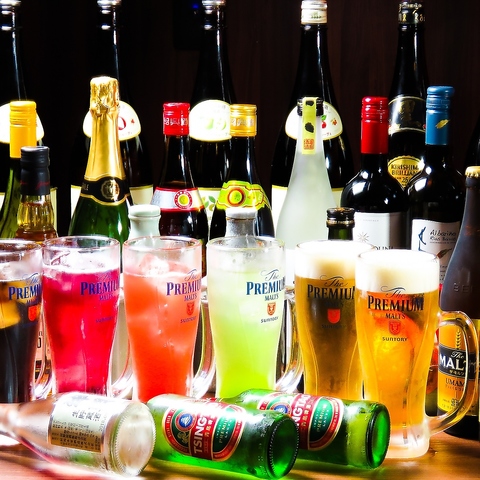 【ドリンクの種類も豊富!】宴会やお祝いなど、さまざまなシーンにぴったりの飲み放題付コースを多数ご用意しております。種類豊富なドリンクを取り揃えていますので、お好みに合わせてお楽しみいただけます。ぜひ、ご同僚やご友人、ご家族と共に楽しいひとときをお過ごしください。ご来店をお待ちしております!