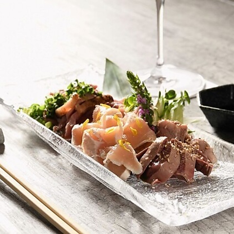 新鮮で質の高い鶏肉だからこそ提供できる鶏の刺身。霜降りささみや地鶏ももたたき、白レバー刺しをご用意しております。焼鳥とは異なる、柔らかくてとろけるような食感と、素材そのものの旨みをお楽しみいただけます。盛り合わせもございますので、ぜひそれぞれの部位を食べ比べてみてください。
