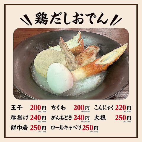 鶏の旨みをじっくり引き出した自慢の鶏だしおでん。素材一つ一つに出汁が染み込み、口に入れた瞬間ほっとする、寒い季節に欠かせない逸品です。