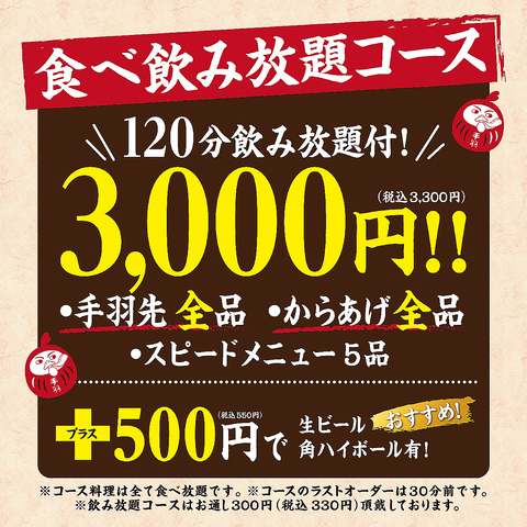 「テバダルマ」名物!手羽先全品・から揚げ全品・おつまみなど合計20品以上が食べ放題+2時間の飲み放題が付いております♪お酒を飲む人も飲まない人も大満足間違いなし!宴会にも仕事帰りにもおすすめの高コスパの大満足コース◎ぜひ一度お試しください!