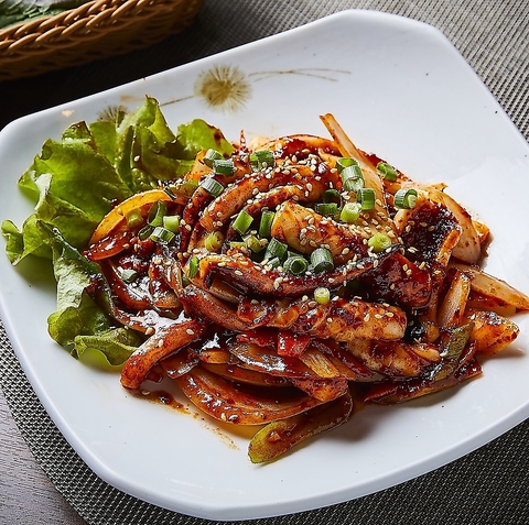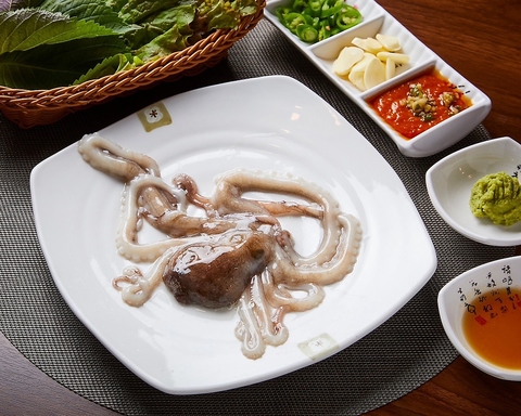 新鮮な生タコは、ぷりっぷりでコリコリの弾力がたまらない一品。噛むたびに広がるほんのり甘みのある旨味がクセになります。特製の甘辛いチョジャン(酢コチュジャン)につけて食べれば、タコの旨味が引き立ち、箸が止まらない美味しさ。食感と味、どちらも楽しめる韓国ならではの海鮮グルメです。