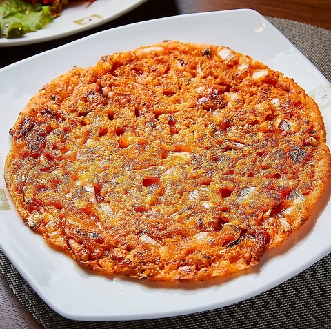 キムチ海鮮チヂミは、ピリ辛キムチの旨味と新鮮な海鮮がたっぷり詰まった韓国の人気料理。プリッとしたエビやイカ、ホタテなどを香ばしい生地に混ぜ込み、カリッと焼き上げました。キムチの程よい酸味と辛みが食欲をそそり、特製醤油ダレで食べるとさらにコクがアップ。ビールやマッコリと相性抜群で、クセになる味わいの一皿です。夏にも冬にも楽しめる韓国伝統の海鮮チヂミをぜひご堪能ください。