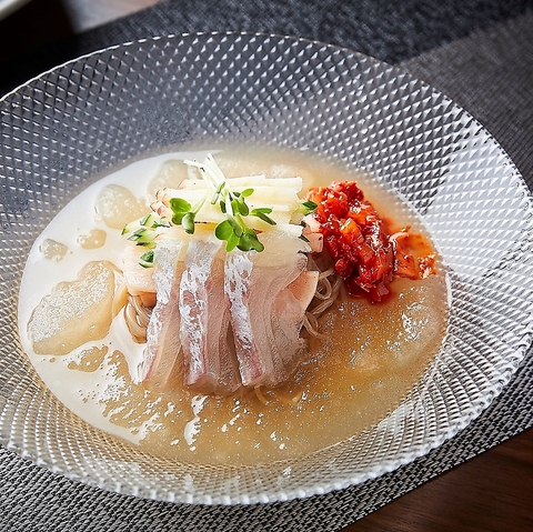 新鮮な魚を、ピリ辛の特製コチュジャン酢味噌でさっぱりと味わう韓国風刺身。シャキシャキのサンチュやエゴマに包んで食べれば、香りと食感が一体となって口いっぱいに広がります。ニンニクや青唐辛子を添え、パンチの効いた味わいにも。日本の刺身とはひと味違う、食べ応えのある韓国流のスタイルは、お酒との相性も抜群。