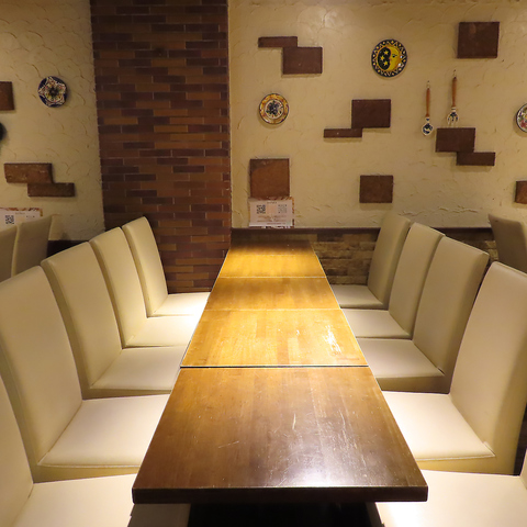 ご友人とのお食事や大人数での宴会にもおすすめなテーブル席。アンティークなレンガと、白を基調にした間接照明の落ち着く空間です。13時よりご利用いただけますので、昼飲み大歓迎!昼宴会は貸切コースで15名~の店舗貸切も可能です。ぜひ自慢のお料理とワインをゆっくりお楽しみください。