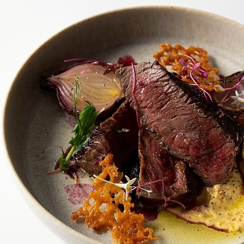 淡路牛ランプの旨みあふれるステーキに、香ばしく甘い夏野菜のローストを添えた逸品。