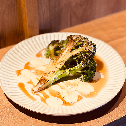 香ばしくグリルしたブロッコリーを贅沢にステーキ仕立てで。濃厚ソースとご一緒に素材の旨みをお楽しみください。
