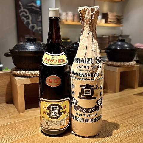 店主が吟味して選んだ石川県で作られる直江屋源兵衛、直源醤油の醤油をお愉しみください。魚の味を引き立てるワンランク上の上質な醤油でお召し上がりください。