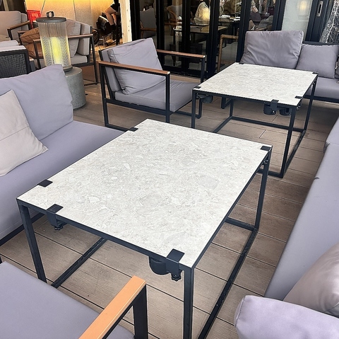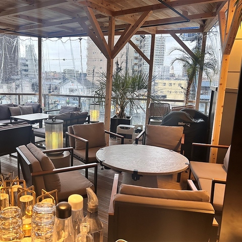【喫煙可能】テラスのソファ席です。最大12名様までご利用可能です。(こちらのお席は18時以降のご利用の場合、テラスチャージとしてお一人様500円頂戴いたします。)