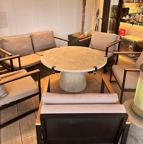 【喫煙可能】テラスのソファ席です。最大六名様までご利用可能です。(こちらのお席は18時以降のご利用の場合、テラスチャージとしてお一人様500円頂戴いたします。)