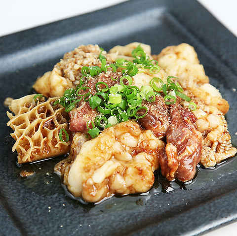 松よし秘伝のチョジャンだれの冷やしホルモン!松よし盛りは5種のホルモン刺しで大人気!