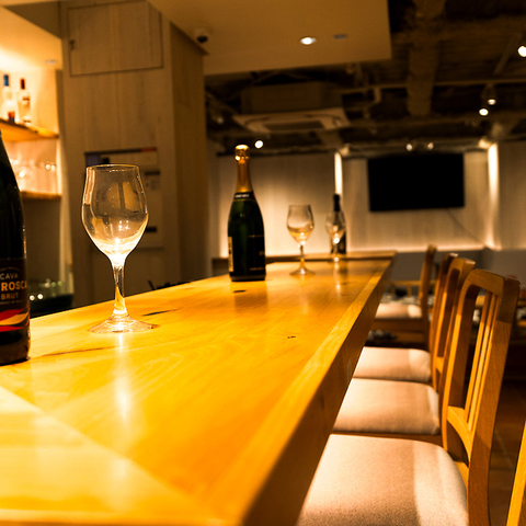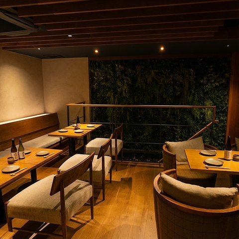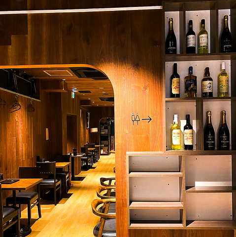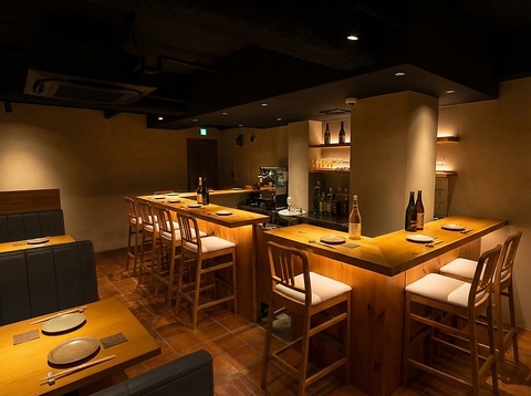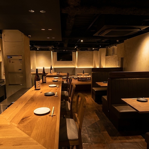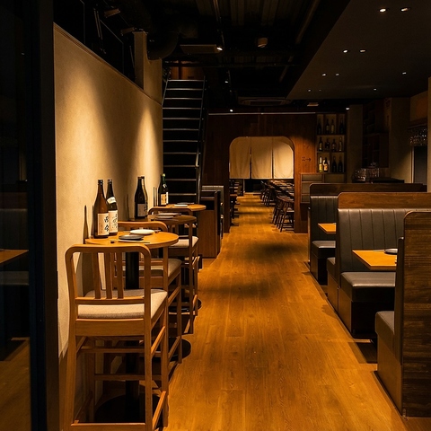木の温もりあふれる落ち着いた雰囲気。柔らかな照明がほどよい陰影を作り、ゆったりと過ごせるボックス席から気軽に立ち寄れるカウンター席まで、幅広いシーンに対応。奥へと続く店内は奥行きがあり、静かに語らいたい時にもぴったり。厳選したお酒と相性抜群の料理を、心地よい空間でゆっくりとお楽しみいただけます。