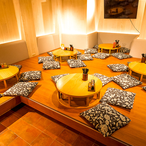 丸テーブルがカワイイお座敷はおうち女子会のような雰囲気。アットホームな空間でくつろぎながらお食事と会話を楽しめます。会社宴会や歓送迎会など各種宴会にもぴったり!